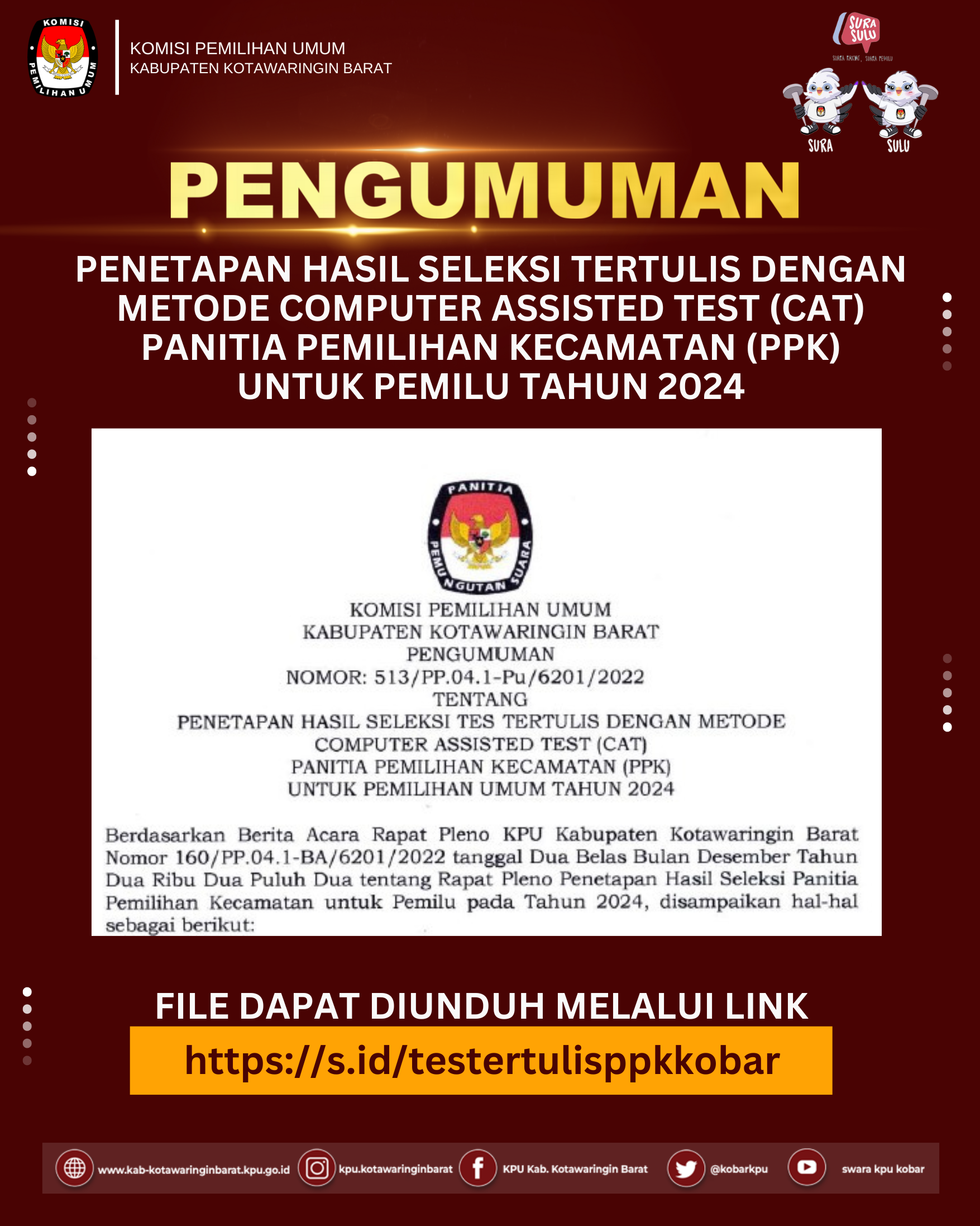 Persyaratan dan Format Pendaftaran dapat diunduh pada tautan/Scan Barcode pada postingan berikut , yuk berpartisipasi dalam Pemilu Serentak Tahun 2024 sebagai Anggota KPPS se Kotawaringin Barat.Simak dan teliti dengan Jadwal penerimaannya, semua persyaratannya...Gaass..Jadi KPPS itu Kereen buangeett.... simak persyaratan lengkapnya di Pengumuman & Formulir KPPS Pemilu 2024